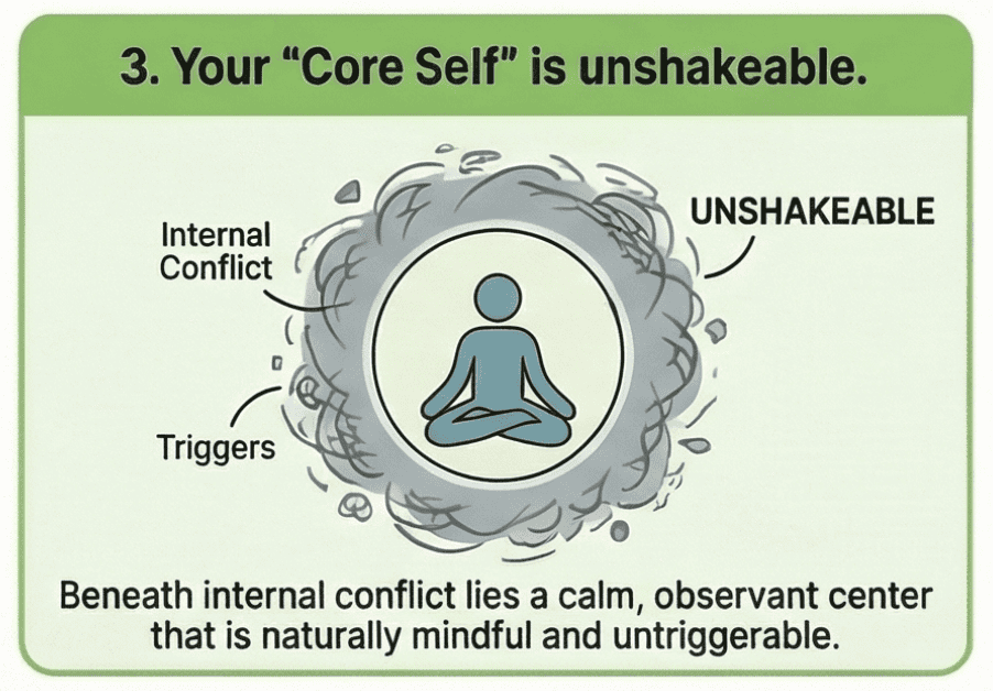 A central concept in this work is “Hijacking.” When we are triggered, it isn’t “us” reacting; it is a “part” that has associated into our experience and taken over the mouthpiece. The Core Self, by definition, is actually untriggerable. It is the expansive part of you that remains in a mindful state, even when a protective part is screaming for attention.