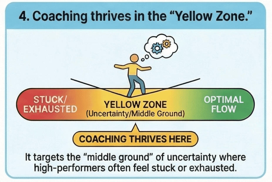 Coaching, by contrast, is the “Feng Shui” of the mind. It is about optimizing the home we live in right now. It involves painting, decorating, and rearranging the layout to ensure the space is functional and aligned with how we want to live. While therapy provides the stable base, coaching focuses on the “present and future,” helping you achieve life goals and enhance daily well-being. Both are necessary, but they serve different roles in the architecture of a healthy life.